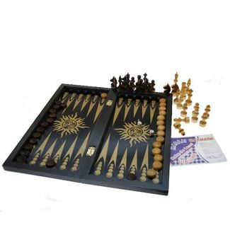 Набор игр 3 в 1 - шахматы, шашки, нарды Цвет - черные с русунком золото Размер в сложенном виде - 400х200мм Материал - дерево, деревянные фишки Оформление - орнамент и оттенок покрытия, могут отличаться от представленного фото None