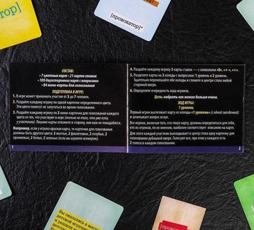 Насколько хорошо вы знаете… Себя, друзей, коллег и то, что они о вас думают! Провокационная игра поможет вам узнать это и да же больше. Интригует, не правда ли…?! А может, я не хочу ничего знать? Ага, уже нахмурились и задумались, а вдруг правда будет не так привлекательна? Не волнуйтесь, в игре нет обидных и ужасных вопросов, которые бы вас задели до глубины души и ко всему в ней 2 раунда, которые можно играть один за другим или вообще использовать как правила к двум разным играм.<br><br> Интересно, что за раунды? Первый раунд игроки тянут карточку, зачитывают написанное на ней и закрытым голосованием решают, кто наиболее подходит к написанному из присутствующих. Первый раунд позволит узнать о себе много нового и неожиданного! Второй раунд один из игроков ведущий, он зачитывает карточку, а потом пишет ответ на листе бумаги, остальные участники должны то же ответить на этот вопрос но не от себя, а предположить, что написал ведущий. Второй раунд поможет спровоцировать на откровенность других. В комплекте: 7 карточек игроков (разного цвета),140 двусторонних карт с вопросами (280 вопросов), 84 карточки голосования, 21 карточка для ставок (оценки). None