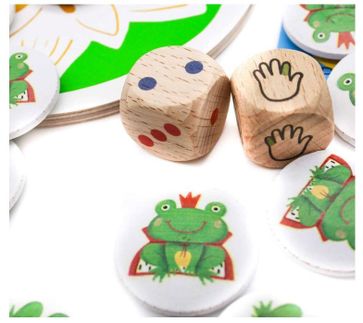 А второй кубик – сколько попыток даётся на достижение цели. Участник берёт и щёлкает по лягушке, или просто толкает пальцем, в направлении кувшинки. Если удалось доставить до места, то эта лягушка считается спасённой и уходит игроку. Так происходит до тех пор, пока все земноводные не окажутся в руках участников. Далее начинается подсчёт очков – кто набрал больше всех и становится безоговорочным победителем.