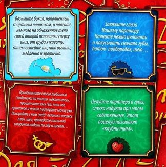 Как разнообразить вечер с любимым человеком и внести новые нотки в интимную жизнь? Очень просто – при помощи игр. Игры бывают разные, но именно эта подарит вам море наслаждения и вариантов возбуждающих предварительных ласк.<br><br> Разложите карточки рубашкой вверх в четыре ряда. Нужно найти парные карточки с одинаковой картинкой. По очереди переворачивайте карточки: совпали – отлично, тогда берите карточку себе и выполняйте пикантное задание на ней. Не совпали, тогда передавайте ход своей второй половине.<br><br> По правилам игры победителем становится тот участник, который собрал больше всего парных картинок. Но после выполнения заданий на карточках вряд ли вам захочется определять победителя, ведь с каждым из них страсти накаляются! None