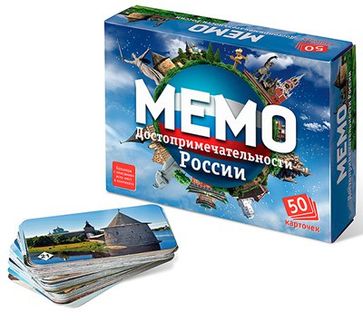 Для детей от 5 лет. Эта игра поможет вам развить вашу память. Вам необходимо собрать как можно больше пар карточек, т.е. две карточки с одинаковой картинкой. Разложите карточки на столе картинками вниз. Начинает игру самый младший игрок и ход переходит по часовой стрелке. Игроки по очереди переворачивают по две карточки таким образом, чтобы все могли видеть изображенные на них картинки. Если картинки на карточках одинаковые, то игрок забирает их. Он может продолжать игру до тех пор, пока он находит карточки с одинаковыми картинками. Если картинки на карточках не совпадают, то игрок кладёт карточки обратно картинками вниз и ход переходит к следующему игроку, сидящему слева. Выигрывает тот игрок, который к концу игры наберет большее количество парных карточек. «Мемо» - игра действительно интересная и удивительно полезная! Она с лёгкостью поднимет настроение большой и маленькой компании. Вы станете поклонником этой игры, попробовав сыграть лишь однажды. "Мемо" — одна из тех редких игр, где успех чаще зависит от способностей и стараний игрока, чем от удачи. "Мемо" — полезная игра с простыми правилами, где дети могут выиграть без "поддавков" у взрослых! Игра состоит из карточек с парными изображениями. Всего 25 пар (50 карточек). Вы и не заметите, как запомните всё, что изображено на карточках. Это игра, безусловно, расширяет кругозор, развивает внимание, тренирует память. Также в комплекте вы найдёте буклет с описанием всех мест, изображённых на карточках. Наверняка, вы узнаете много нового. А если у вас есть карта (мира, России, Санкт-Петербурга), то вы можете усложнить игру, добавив в неё задание, где ребёнку предлагается расположить карточку в соответствии с её реальным местоположением на карте. А может быть, после этого вы захотите всей семьёй увидеть воочию это место?!!! Ведь в России и мире есть столько удивительных мест, где действительно стоит побывать! Играйте в «Мемо