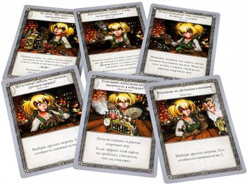 Очень просто! Правила здесь написаны на игральных картах, а игроки ходят в порядке очереди. Каждый «пьяница» берет себе колоду персонажа (это 40 карточек), 10 монет, отмечает свою стойкость на уровне 20, а степень о