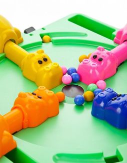 Данная настольная игра отлично подходит как для взрослых компаний, так и для детских, ведь здесь в правилах нет ничего сложного, а весь игровой процесс очень увлекателен. Все, что необходимо делать – ловить шарики своим бегемотиком. Шарики вылетают из центрального отверстия, причем в совершенно неожиданных направлениях. Чтобы их поймать, необходимо использовать рычажок на теле бегемота, посредством которого можно изменять длину его шеи и открывать большой рот. Все кажется достаточно простым, не так ли? Но в процессе игры с другими участниками, которых может быть вплоть до 4 человек – вырастает дух соперничества, ведь чем больше скушаешь, тем скорее выиграешь.