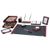 Настольный набор премиум-класса из дерева цвета "красное дерево" с золотистой фурнитурой состоит из 10 предметов. Набор содержит всё необходимое для того, чтобы сделать рабочее место не только комфортным, но и элегантным. Комплектация:двойной лоток для бумаг;коврик для письма (размер - 67х42,5 см);подставка для ручек (2 шариковые ручки в комплекте);стакан-подставка для письменных принадлежностей;подставка для бумажного блока;подставка для визиток;нож для вскрытия конвертов;подставка для перекидного календаря;фоторамка;часы. None