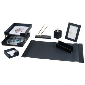 Настольный набор премиум-класса из дерева черного цвета с золотистой фурнитурой состоит из 7 предметов. Набор содержит всё необходимое для того, чтобы сделать рабочее место не только комфортным, но и элегантным. Комплектация:двойной лоток для бумаг;коврик для письма (размер - 64,5х42,5 см);подставка для ручек (2 шариковые ручки в комплекте);стакан-подставка для письменных принадлежностей;подставка для бумажного блока;подставка для писем;фоторамка. None
