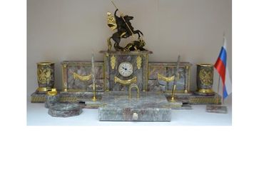 Настольный письменный набор из серо-розового мрамора ''Георгий-Победоносец''Размер: 500х380х20Материал: натуральный долерит, бронза, латунь.Комплектация: Часы настольные с бронзовой скульптурой -1шт. Подставки под письменные принадлежности -2шт. Подставки под бумаги -2шт.&n None