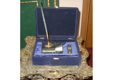 Письменный набор "Подарочный"Набор ручной работы. Выполнен из камня змеевик, бронзы и латуни.В набор входит:- Визитница с подставкой под ручку - Флеш карта на 8 Г.б. None