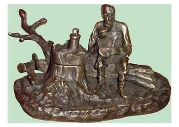 Русские мотивы, особенно в прикладном творчестве XIX века, ярко проявились. С того времени «русские» темы, особенно по роду занятий, в бронзе неиссякаемы. Нашим мастерам «русская» тематика не безразлична. Этот письменный прибор служит подтверждением. На рухнувшем дереве сидит старый мужчина – зажиточный крестьянин, в добротных яловых сапогах. Впереди у него – дальний путь: торба с продуктами стоит на пне (чер None