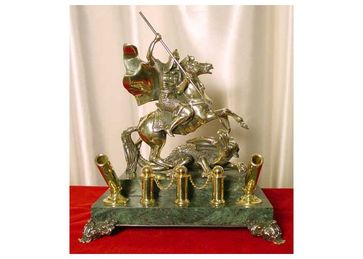 Георгий Победоносец - один из самых чтимых русских святых, покровитель Москвы и Русского государства. На Руси почитание его получило особое значение. Этого святого воспринимали как покровителя всего русского народа. Образ его, на коне и поражающего змея, вошел в герб Русского государства. В основе этого почитания, по-видимому, лежит древнерусский языческий культ Дажьбога, до Крещения Руси также считавшегося покровителем и родоначальником русского народа. Письменный прибор изготовлен из позоло None