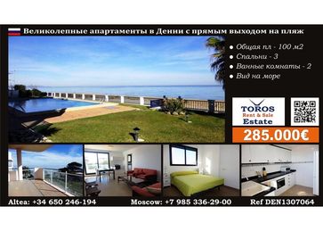 Продам великолепные апартаменты в Дении (Испания, Коста-Бланка) в комплексе 2008 г. с бассейном и прямым выходом на пляж. Просторная квартира 100 м2, 3 спальни, 2 ванные комнаты, салон, терраса с видом на море, электрические жалюзи, кондиционер (тепло/холод), отдельная кухня, полностью укомплектованы мебелью и бытовой техникой. Цена 285.000€