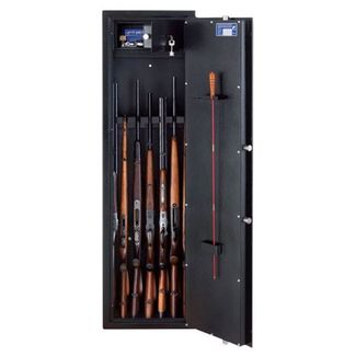 Стальная защита корпуса, увеличенный ход ригелей, замки евростандарта. Взломостойкий сейф вмещает 7 единиц оружия высотой до 1220мм. Сертифицирован на взломостойкость по ев None