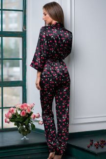 Комплект состоит из жакета с запахом и длинными рукавами, топа на тонких бретелях и брюк. Комплект выполнен из принтованного искусственного атласного шелка. Рукава и планка жакета декорированы вишневым кантом. По центру лифа топа – декоративный бантик. В комплекте: жакет, топ и брюки. None