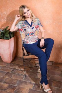 Великолепный комплект. Состоит из блузы и брюк. Блуза выполнена из вискозы с фантазийным принтом. Модель с цельновыкроенными короткими рукавами и фигурным низом. Круглый вырез горловины на полочке с V-образным разрезом, а также круглый вырез горловины спинки обработаны притачной обтачкой из однотонной вискозы, что является декором данной модели. По шву притачивания обтачки к горловине полочки и спинки заложена мягкая драпировка. Брюки с боковыми разрезами по низу и карманами в боковых швах, выполнены из однотонной вискозы. В комплекте: блузка, брюки. None