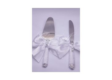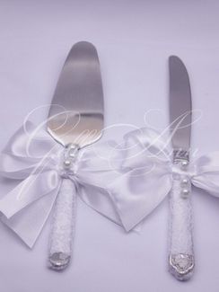 Набор для торта Gilliann Ice Lady CIA015 Нож и лопатка для торта. Один из предметов полного комплекта, декорированы белыми атласными лентами, жемчугом. Нож и лопатка для торта добавят изюминку и украсят вашу свадьбу. Материалы и декор: нож, лопатка, декоративные элементы. None