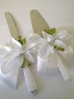 Набор для торта Gilliann Felicity CIA024 Нож и лопатка для торта - обязательный атрибут красивой церемонии разрезания свадебного торта. Разнокалиберные приборы недопустимы, они способны испортить даже самый красивый, искусно украшенный торт, к тому же такие моменты всегда фотографируют, поэтому будут испорчены и свадебные фотографии. Набор для торта Gilliann Felicity станет достойным украшением торжественного ужина. Нож и лопатка украшены белыми роскошными цветами в обрамлении зеленых листьев. В центре распустившегося цветка - крупная жемчужина. Материалы и декор: нож, лопатка, атласные ленты, декоративные элементы, жемчуг. None
