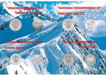 - СОЧИ-2014 «Горы». Медно-никелевая монета, не драгоценная, в блистерной упаковке. Номиналом 25 рублей, отчеканена в 2011 г.
