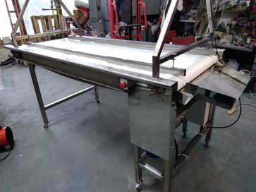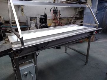 Конвейер предназначен для облегчения и ускорения ручной переборки орехов. Боковые желобы из нержавеющей стали могут переставляться по длине конвейера, для удобства работников.