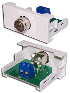 С лицевой стороны модуль оснащен гнездом EVRO TV female («мама»). Фиксация жил подводимого кабеля осуществляется в винтовом блоке.