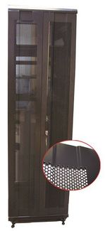 Замок является надежной защитой от несанкционированного доступа. Распашная дверь позволяет экономить пространство в серверной комнате за счет уменьшенного радиуса открывания двери. Перфорация двери способствует охлаждению активного оборудования, расположенного внутри шкафа.