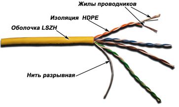 Расшифровка кабеля LAN-5EUTP-PT: U - unfoiled (нефольгированный, неэкранированный).TP - twisted pair - витая пара. Конструкции кабеля LAN-5EUTP-PT: