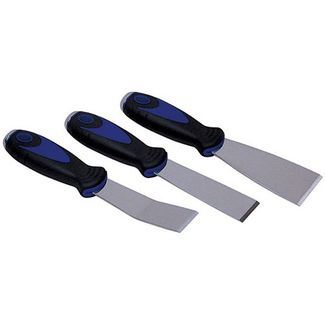 Набор скребков из трех предметов. Набор из трех разных скребков с неподвижными лезвиями из полированной пружинной стали. С металлическим наконечником на ручке. В набор входят: 1 лезвие длиной прибл. 100 мм, шириной 50 мм 1 лезвие длиной прибл. 100 мм, шириной 32 мм 1 лезвие длиной прибл. 100 мм, шириной 32 мм, выгнутое None
