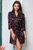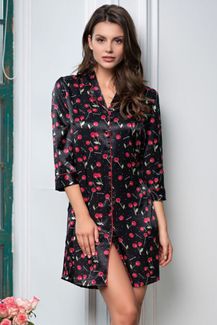 Короткий халат-рубашка с английским воротником, с застежкой на пуговицы, с рукавами 3/4 выполнена из принтованного искусственного атласного шелка. Рукава, воротник и борт рубашки декорированы вишневым кантом. None