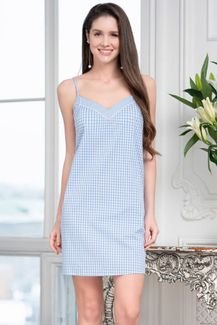 Короткая сорочка на тонких бретелях без подреза под грудью, выполнена из сочетания 2-х видов клетки. Белый кант подчеркивает вырез сорочки. None