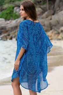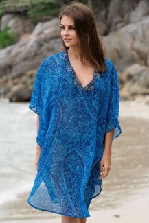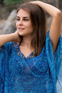 Короткая туника с рукавом летучая мышь выполнена из принтованного шифона в морской гамме, низ туники имеет овальную форму, горловина оформлена бисером и пайетками. None