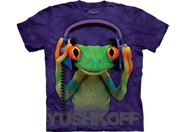 Детская футболка фиолетового цвета с изображением лягушки в наушниках.