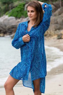 Платье-рубашка с длинным рукавом выполнено из принтованного шифона в морской гамме. Центральная застежка декорирована пуговицами в тон ткани. По бокам платья разрезы. Рукава с манжетами регулируются по длине с помощью пат. None