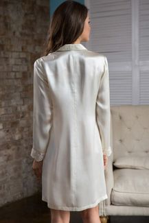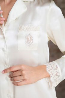 Рубашка средней длины полуприлегающего силуэта из натурального шелка, с отложным воротником, застегивается на пуговицы. На груди накладной карман с фирменной вышитой монограммой по ткани ручной работы. Рукава на манжете, выполненного из кружевного полотна. None