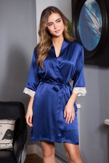 Короткий халат прямого силуэта выполнен из натурального шелка. Модель на поясе, с втачным рукавом на манжете, выполненный из кружевного полотна. Халат по борту на обтачке, на талии завязывается на внутреннюю завязку. None