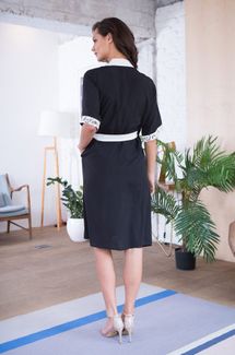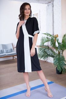 Халат домашний женский выполнен из сочетания белого и черного крепа. Модель с прямым рукавом длиной до локтя, окантованным кружевом. Халат длиной ниже колена. Модель на поясе с карманами в боковых швах. None