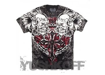 Футболка с изображеннием двух черепов и креста с надписью "Free live" (чёрного цвета)