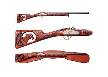 Ружьё со стальным стволом, латунным капсульным замком, резьба, травление по металлу. Ружьё производит шумовой эффект, благодаря заряжанию охотничьими капсулями. Заключение: представленное изделие является сувениром (отсутствие запального устройства). Поставляется на простом стенде. Историческая справка: 2-я Половина 19 века. Изготавливались по заказу морского кадет None