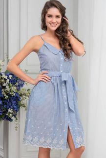 Элегантный сарафан Nizza на тонких бретелях, с отрезной линией талии выполнен из натурального хлопка в голубую полоску. Сарафан длиной до линии колен, спереди застегивается на пуговицы. Линия декольте украшена декоративным отложным воротничком с кантом, тонкие бретели регулируются. В боковых швах карманы. Низ изделия декорирован вышивкой молочного цвета. В комплект к сарафану идет пояс, чтобы еще больше подчеркнуть женственный силуэт. None