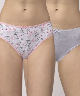 Набор из двух трусов. Одни с нежным цветочным принтом. Вторые однотонные, серый меланж. Изготовлены из мягкого хлопка с добавлением эластичных волокон. Материал хорошо тянется, поэтому изделие комфортно облегает фигуру. None