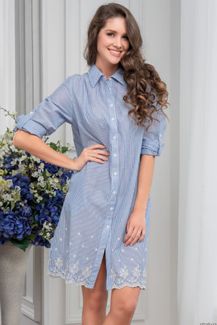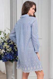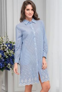 Рубашка-платье Nizza прямого силуэта, длиной чуть выше линии колен, с длинным рукавом, выполнена из натурального хлопка в голубую полоску. Воротник отложной со стойкой, по бокам прорезные карманы в рамку, в боковых швах разрезы. Длина рукавов регулируется хлястиком. На спинке кокетка. Низ рубашки украшен вышивкой молочного цвета. None