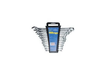 Ключи изготовлены из хромванадиевой стали. Твердость материала рабочей части ключа 45 HRc (требования ГОСТ – 45–51 HRc). Ключи имеют хромированное покрытие. Профиль кольцевого зева имеет 12 граней, что увеличивает площадь соприкосновения рабочих поверхностей и снижает риск деформации граней крепежа при монтаже. Угол наклона кольцевого зева относительно плоскости ключа в 15 градусов делает монтаж более удобным. Ключи поставляются в комплекте с трапециевидным пластмассовым держателем. Набор предназначен для монтажа демонтажа резьбовых соединений. None
