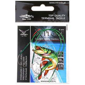 Поводки Mikado X-Plode это широкая линейка различных моделей, изготовленных из переплетенных между собой тросов из стали, вольфрама или титана. Предложение включает как основные аксессуары – поводки с вертлюжком и застежкой для самостоятельного крепления, так и специальные поводки, оснащенные крючками или якорями. Доступные в версиях разной длины и устойчивости к разрыву, предлагаются в упаковках по две штуки и в наборах по 30/60/75 штук. None