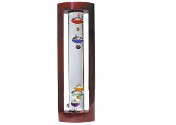 Физические законы действия этого прибора были открыты еще великим Галилеем свыше 400 лет назад. В термометре Галилея температуру указывает диск, прикрепленный к самому нижнему стеклянному шарику, плаваюющему в верхней части сосуда.