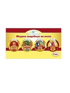 Комплект свадебных медалей на ленте - 4 шт (GKMP 066.417) STA903 Яркие медали для отличившихся участников свадебного торжества. На каждую медаль нанесен тематический рисунок с надписью, прилагается атласная лента. Такой отличительный знак на груди захочет получить каждый гость. Материал: кашированный картон, атласная лента Размер: диаметр 90 мм. Количество: 4 шт. Мин. заказ 500 руб.