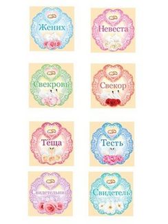 Набор свадебных медалей (8 шт.) (GKIM 70.630.00) STA866 Медали для главных членов свадебного торжества - молодоженов, свидетелей, родителей с обеих сторон. Каждая медаль оформлена в своей цветовой гамме, украшена цветами, в верхней части - обручальные кольца, обрамленные в сердечко. Количество: 8 шт. Мин. заказ 500 руб.