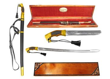 Гарнитур с шашкой в деревянном футляре. Производство Россия. Историческая справка: Произошло от кабард.-черкес. Са шхо – длинный нож, холодное рубяще-колющее оружие со слегка изогнутым однолезвийным клинком, обоюдоострым концом и эфесом без гарды (за исключением некоторых образцов). Высочайше утвержденная казачья шашка была разработана в 1881 году ге None