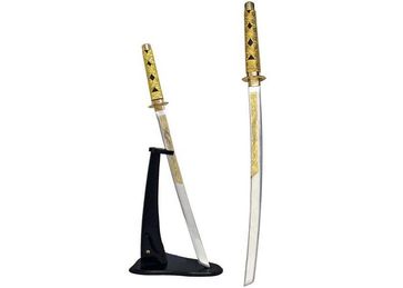 Вакидзаси на вертикальной подставке, рукоять плетение тесьма. Производство Россия. Историческая справка: Первоначально воины царства Ямато имели на вооружении один меч и один нож. Со временем мечи стали носить в паре: короткий и длинный, сохранив при этом еще и нож. Во времена сегуната Асихага традиция носить два меча стала обязательной для всех самураев & None