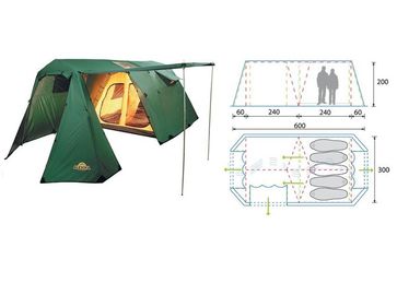 <h2>Пятиместная кемпинговая палатка с тремя входами</h2> <h3>Технические особенности:</h3><ul> <li>Внутренняя палатка разделена на две спальни съёмной перегородкой. </li> <li>Стальные стойки диаметром 16 мм, антимоскитная сетка на входах в тамбур и во внутреннюю палатку. </li> <li></li> <li>Съёмная спальня позволяет использовать всю площадь палатки под кухню или столовую. </li> <li>Три вентиляционных отверстия</li> <li>Два окна</li> <li>Швы проклеены.</li> <li>Усиление углов</li> <li>Пропитка, задерживающая распространение огня</li> <li>Швы герметизированы термоусадочной лентой</li> <li>Размеры внешней палатки 600x300x200 см</li> <li>Размеры в чехле 20x20x89 см</li> <li>Вес 21,7</li> </ul> None Можно купить без предварительного заказа. Возможен самовывоз. Есть доставка.