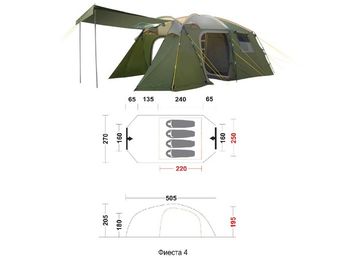 <p>Четырехместная кемпинговая палатка большого объема. Каркас с изломом, переходник для дуг с заданным углом позволяют значительно увеличить внутренний объем, что в свою очередь, побуждает ценителей комфорта купить кемпипинговую палатку Фиеста 4. Спальное отделение имеет перегородку в виде шторки, позволяющей комфортно разместиться всем участникам путешествия. Противомоскитные сетки во внутренней палатке и тамбуре.</p> <h2>Технические характеристики</h2> <ul> <li>Вес: 14,4 кг</li> <li>Тип: кемпинговые</li> <li>Серия: Отдых на природе</li> <li>Вместимость (человек): 4</li> <li>Ткань тента: Poly Taffeta 185T PU 3000</li> <li>Ткань палатки: Poly Taffeta 180T</li> <li>Ткань пола: Oxford 150D PU 4000</li> <li>Дуги: Fiberglass 9,5/11 mm</li> </ul> <h2>Доп. преимущества</h2><ul> <li>Повышенная водонепроницаемость дна</li> <li>Проклеенные швы тента</li> <li>Противомоскитная сетка</li> <li>Прозрачные окна</li></ul> None Можно купить без предварительного заказа. Возможен самовывоз. Есть доставка.