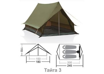 <p>Палатка Тайга - это прежде всего палатка для охоты и рыбалки, она мало весит, в ней можно спрятаться от дождя и заночевать, чувствуя себя уютно. Антимоскитная сетка спасет от насекомых. Палатка Тайга устанавливается без стоек.</p> <h2>Технические характеристики</h2> <ul> <li>Вес: 2,4 кг</li> <li>Вместимость (человек): 3</li> <li>Ткань тента: Oxford 150D PU 2000</li> <li>Ткань палатки: Poly Taffeta 210T</li> <li>Ткань пола: Oxford 150D PU 3000</li> <li>Стойки: Сталь 16 мм</li> </ul> <h2>Доп. преимущества</h2> <ul> <li>Повышенная водонепроницаемость дна</li> <li>Проклеенные швы тента</li> <li>Противомоскитная сетка</li> <li>Карманы</li></ul> None Можно купить без предварительного заказа. Возможен самовывоз. Есть доставка.
