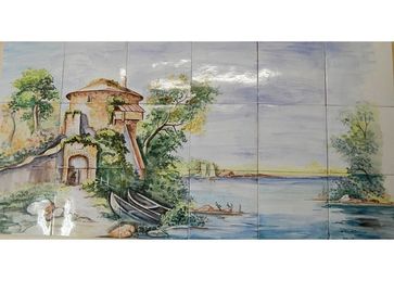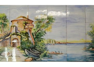 Панно написано на изразцах ручной работы, роспись выполнена специальными керамическими красками. Размер: 1025 х 615 мм, толщиной 16 мм.
