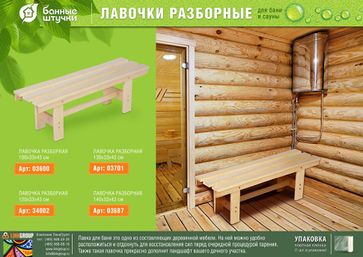 - Лавочка разборная Банные Штучки липа 120х33х43 см 34002 в каталоге Печи для саун и бань в Москве;